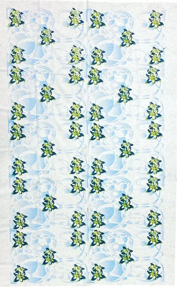 After Transferring the layers onto three a3 sized screen-print frames. i used mixed paints that matched each layers thought out color, then printed the design on a large plain cotton fabric.